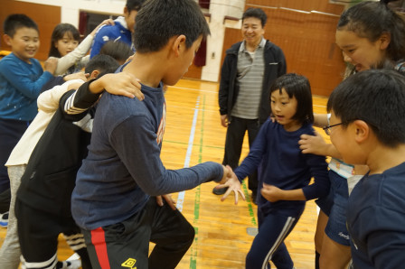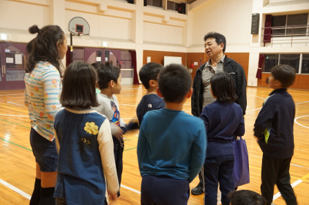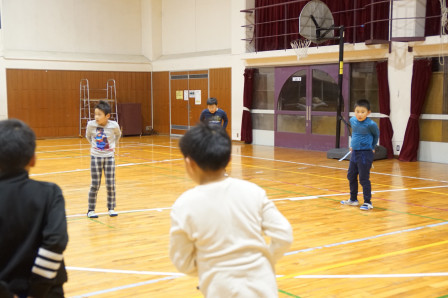 食事を終えて、7時半から体育館で赤坂屋先生のもと、お菓子をかけたレクレーション。