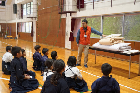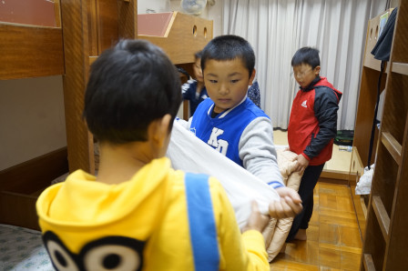 早速現地にて道着に着替え、自然の家の方から布団のシーツの付け方、片付け方等、共同生活で必要な事を教えて頂きました。