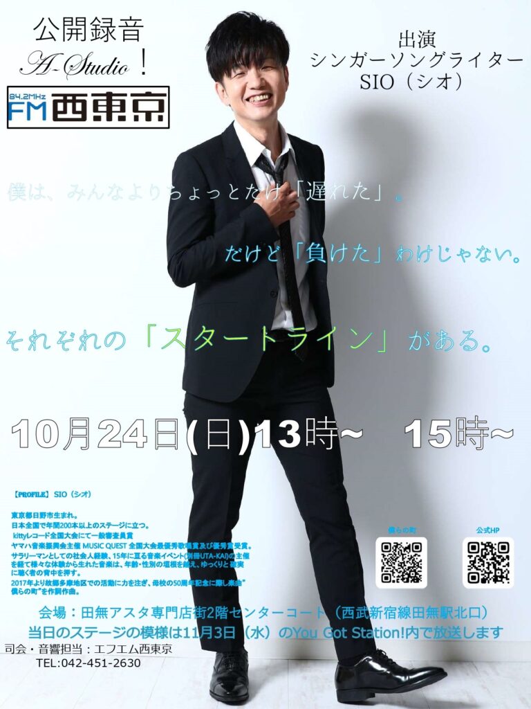 10/24 日 FM西東京様 フリーライブ&公録【公開録音アスタジオ!】10/24(日)シンガーソングライター:SIO(シオ)アスタセンターコートで開催される 観覧無料の公開イベント公開録音「アスタジオ!」 【スケジュール】 10月24日(土) 13時~ 15時~ 【今回の出演者】 シンガーソングライター SIO(シオ) 【放送日】 ...842fm.com田無駅前の広場での有観客フリーライブです2020年の2月ぶりでしょうか?多摩地区でのフリーライブは。感染対策をしっかりして物販などもさせていただきます。久しぶりのアスタジオライブ出演楽しみです♪観覧無料です宜しくお願いいたします。