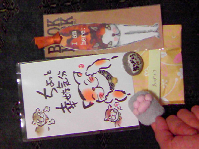 絵ハガキとノビをするネコのシオリ、お辞儀ネコ、ストラップっす。