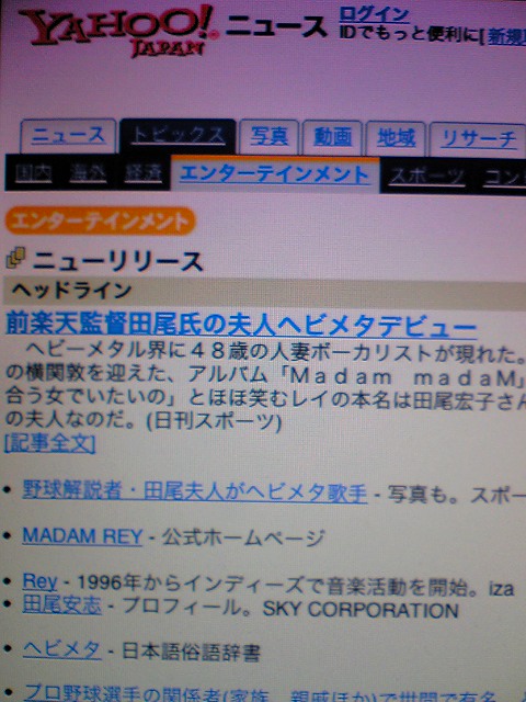 もうかれこれ10年以上のお付き合いになるMADAM REY(元楽天監督・田尾安志さんの奥様、宏子さん)のメタル・デビューの記事が、Yahoo! JAPANのトピックスに出ておりました!そろそろライブの告知もさせてもらおうと思ってたんですが、ヤフトピのおかげで日本中に知れ渡りましたね(^^)