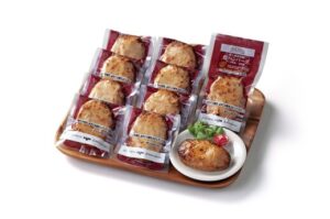 銘柄豚「館ヶ森高原豚」を100%使用した「焼きハンバーグ」です。豚肉を粗挽きにすることで肉感をアップし、豚肉発酵調味料「豚醤」を使用し旨みを引き出しています。