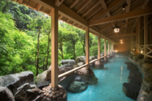 森に囲まれた立ち湯の露天風呂や渓流沿いの露天風呂を満喫。