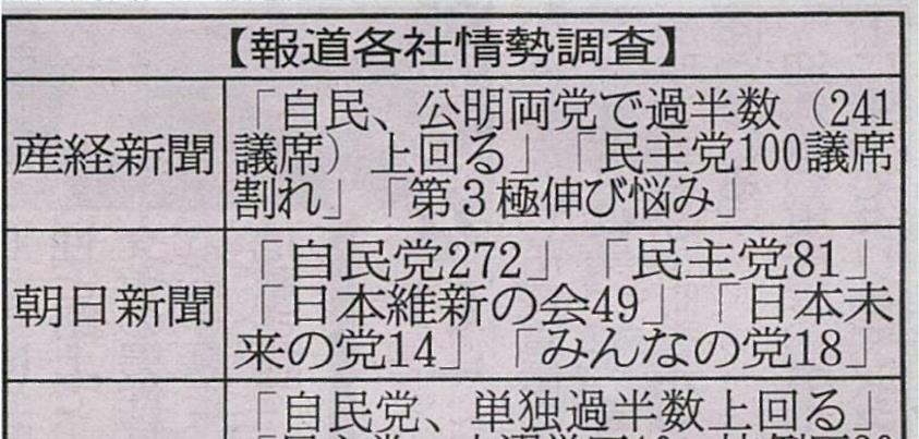 この朝日の自民党272議席はあやしい。実際は産経の方だろう。気持ちを引き締めよう