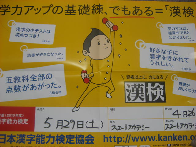 2010年度第一回漢検日程決定こんにちは、スマートアカデミーの宮澤です。本日も冷たい雨が降っています、体調をくずさないようにしてください。2010年度第一回漢検の日程が決まりましたのでお知らせします。5月29日(土曜)に開催します。時間割は後日お知らせします。塾生以外の受験も可能ですのでスマートアカデミー各教室にてお申込ください。締め切りは4月26日(月曜日)です。目指せ3級(中学卒業までに)!
