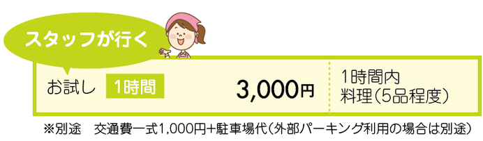 彩香メニュー・・・2時間コース・3時間コース共に「お料理代行」のみとなります。 またスタッフは「1時間お試しコース」が利用できます