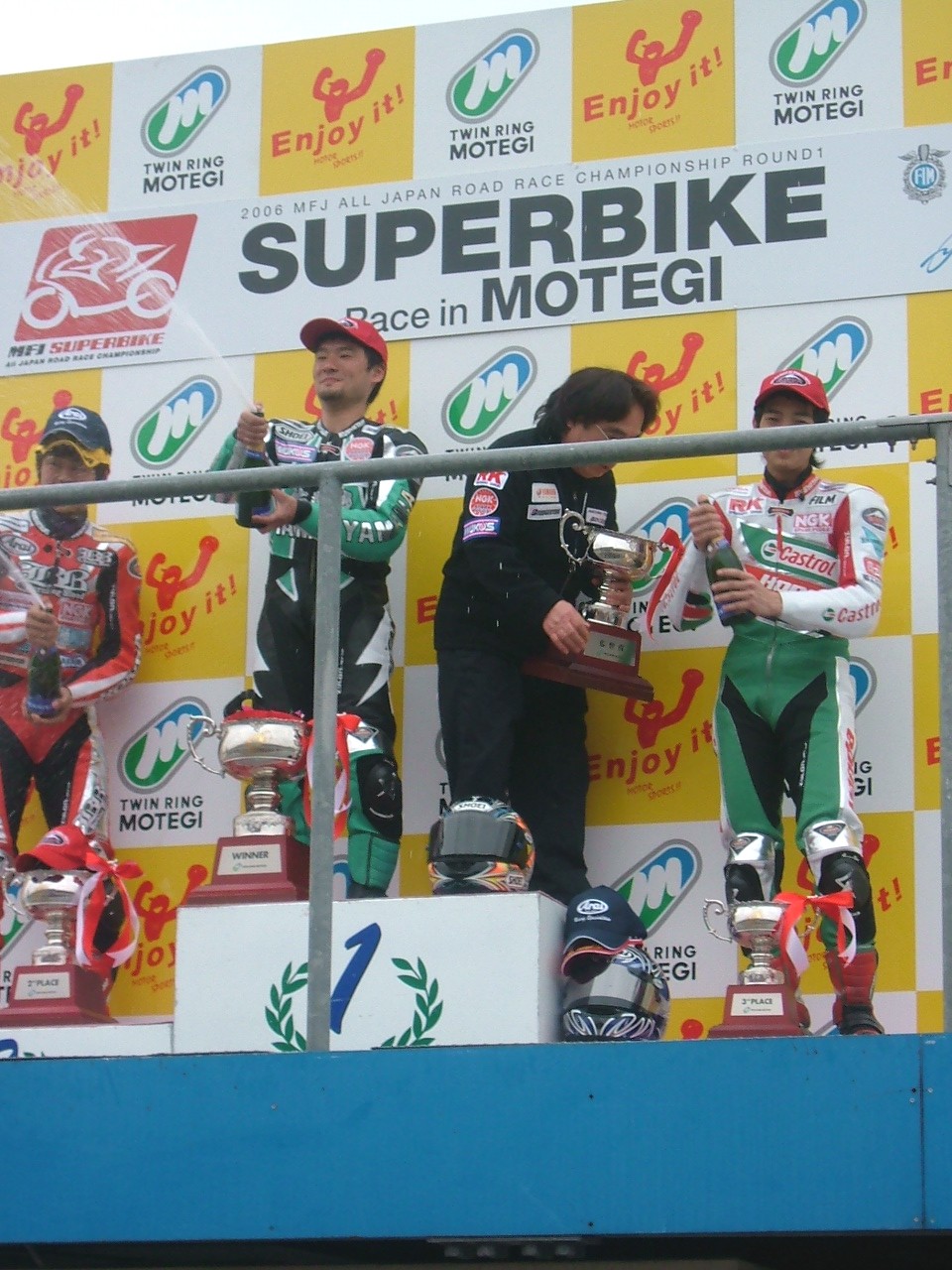 表彰台のてっぺんに立つ横江選手のシャンペンシャワー。