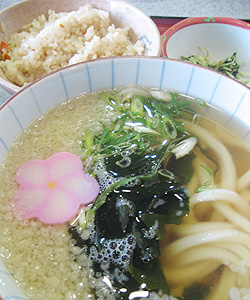 太くてもちもちのうどんに甘い目のお出しと炊き込みご飯に漬物