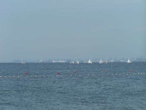 この写真は陳列された方の稲毛海岸の海水浴場表示ブイと遠くにヨットの見える写真です。