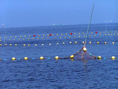 千葉市の稲毛海岸海水浴場のオープンが近いようで境界のブイが設置されました。