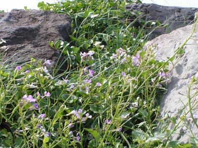 稲毛海岸のハマヒルガオの咲いている場所には、ハマダイコンも咲いています。