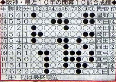 10戦目までで2敗しかしない年は、2位か優勝です。