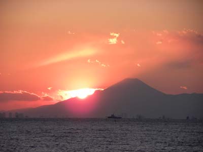 海岸を千葉方向に向かいました。夕日の落ち方で富士の頂に沈むのを、