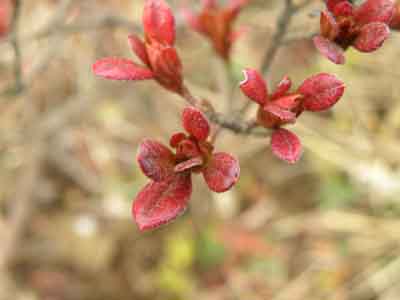 カワヅザクラの蕾やツツジの新芽が綺麗です