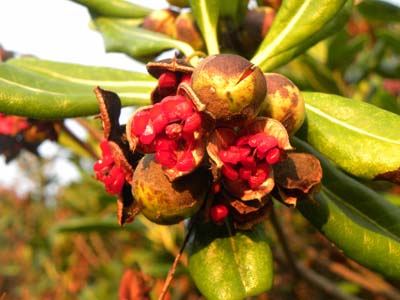 まっ黄色に染まっています。トベラは赤い種を出しています。