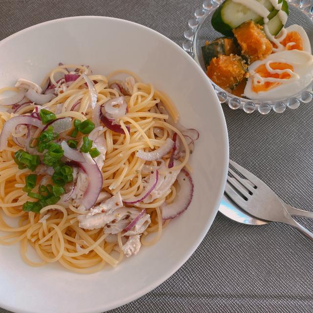 ササミと紫玉ねぎの冷製パスタ お昼ご飯SnapDishに投稿されたサチャンさんの料理「ササミと紫玉ねぎの冷製パスタ お昼ご飯 (ID:juTLTa)」です。「作り置きササミと紫玉ねぎの粒マスタード和えをパスタに そしてかぼちゃサラダと見せかけて味噌はちみつバターでレンチンしたかぼちゃと和えたものでした 涼しくて冷房付けてたっけくらいのひんやりした風が入ってきてる 涼しいと元気 簡単料理 …snapdish.co