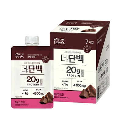 STAY WEEKの動画で紹介してくれたプロテインシェイク。ビングレはバナナウユの会社!あそこが作るタンパク質で、かつスンミンのおすすめなら味は間違いなさそう。韓国でよくあるこのタイプのシェイクはこのパウチに牛乳や水を注いで振るだけで飲めるので、すごく便利です🍫🥛