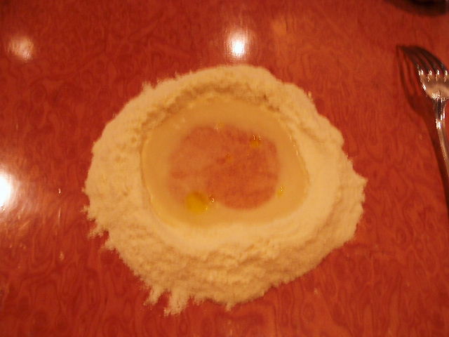 デュラムセモリナ粉をテーブルに盛り、まんなかに穴をあけて水を入れる。オリーブオイルも少々。堤防が決壊しないよう、内側から崩していきます。もんじゃ焼きの要領ね。ある程度混ざって、水分が流れ出なくなったら後は手でこねちゃう。こねあげたら生地を少し寝かせます。