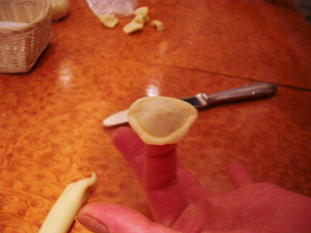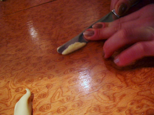 細長くしたものを端から小さく切ってナイフをあて、ナイフを左から右へ動かし、薄くクルリンとさせます。(手の出演:T嬢)
