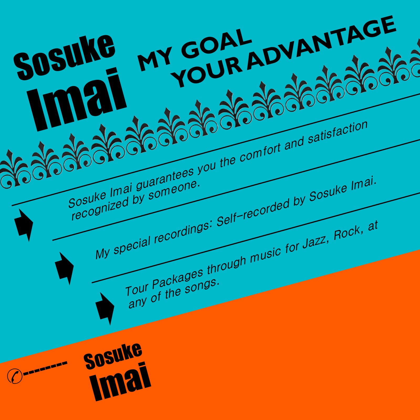 親戚からいただいた70年代初頭ヨーロッパのホテルのチラシをもとにデザインしました。青、赤の強いコントラストと黒のブロック体フォント、古い庭の柵のような模様や配置のバランスがとても美しいチラシです。また、アルバム英タイトルの「My Goal Your Advantage」というのも、このチラシから取ったものです。簡単に訳すと、「私の目標は、あなたにとっての優位性をもたらすこと」みたいな感じです。ちなみに、日本語タイトルはアルベールラモリスの映画からとりました。