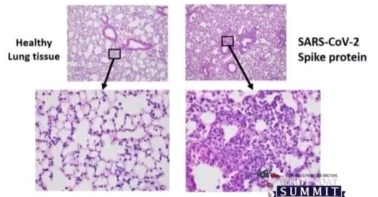 健康な肺の組織(左側)と、スパイクタンパク質により損傷を受けた組織(右側)とを比較すると、右側では、紫色が多くなっていることが分かる。これは、全部炎症である。免疫系が自分の体を攻撃することによって炎症反応が発生する。