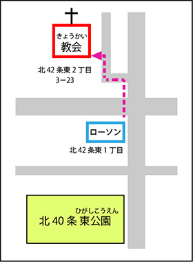 校区外で一人で教会に来れないおともだちのために、北42条東1丁目のローソン前に、教会のお兄さん・お姉さんがお迎えに行きます。