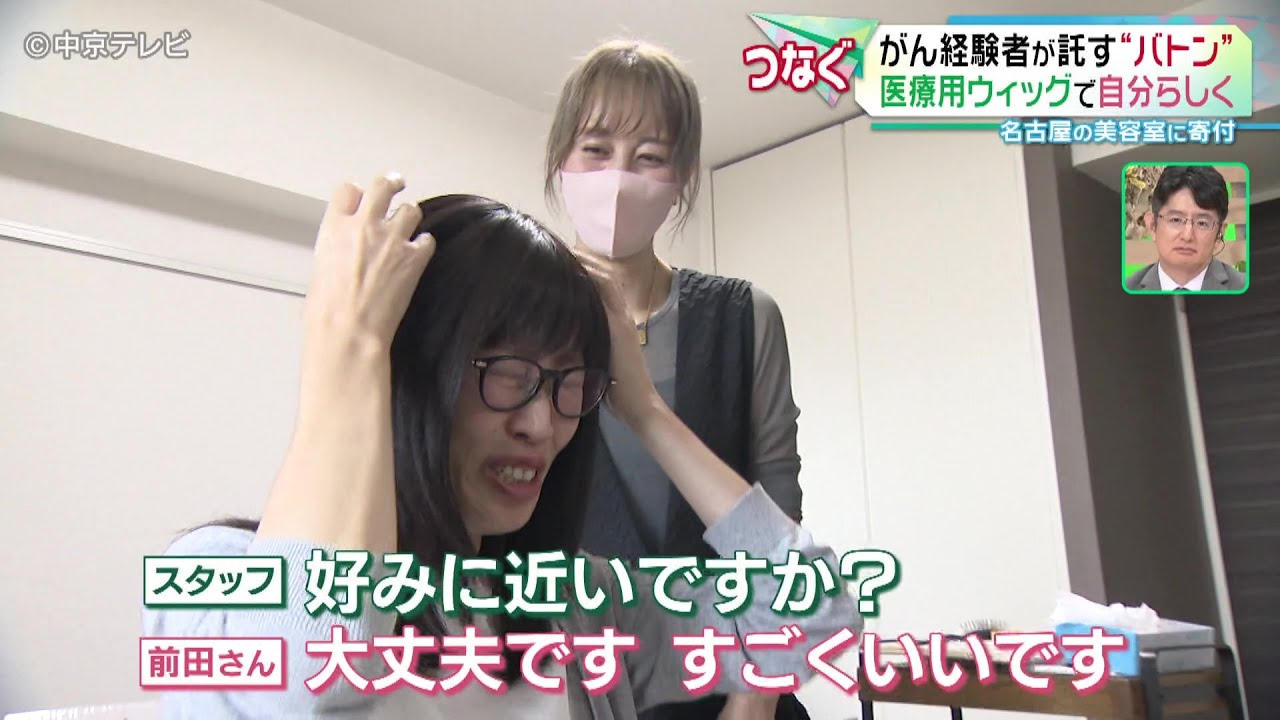中京テレビ「キャッチ」で医療用リユースウィッグの取り組み(寄付から購入まで)を恩田アナウンサーにご紹介いただきました。