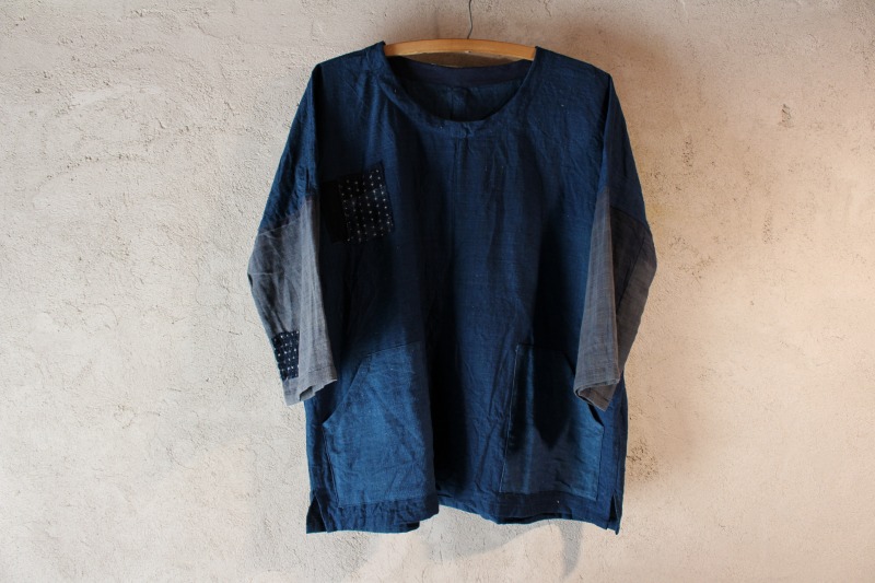 上は明治時代頃の藍染め木綿をツギハギして製作したうわっぱり。