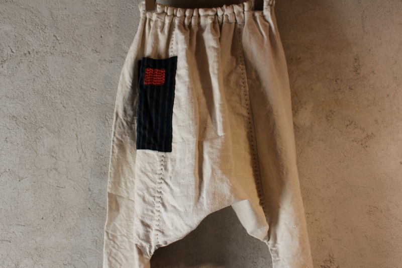 下はヨーロッパのアンティークリネンを使い、古布と刺し子をほどこしたサルエルパンツ。