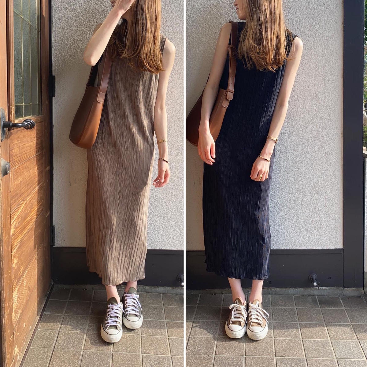 実は、これと同じ素材でモカブラウンのプリーツマキシワンピースを持っていて。