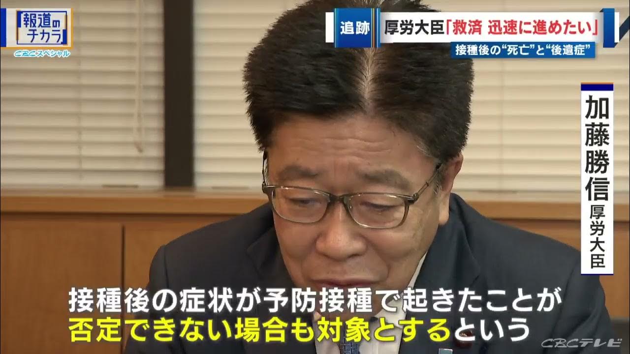 新型コロナワクチン接種後死亡や“後遺症” 加藤厚労大臣「救済を迅速に進めたい」【報道のチカラ】新型コロナワクチンの接種後に死亡したり、体調不良に陥る“後遺症”に苦しんだりする事例が相次いでいる問題について、加藤勝信厚生労働大臣は、12月16日午後、CBCテレビ「報道のチカラ」の取材に応じ、「救済を迅速に進めたい」と話しました。まずは、副反応の救済認定のあり方について、聞きました。(加藤厚生労働大臣)「厚労...youtu.be