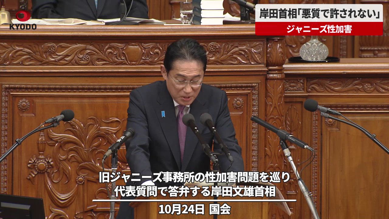ジャニーズ性加害、悪質で許されないと岸田首相 国会代表質問、衆院本会議で - 共同通信【速報動画】 | Yahoo! JAPAN岸田文雄首相の所信表明演説に対する各党代表質問が24日午後、衆院本会議で始まった。岸田首相は代表質問で、旧ジャニーズ事務所の性加害問題を巡り「子どもや若者への性暴力は心身に深刻な影響を及ぼす極めて悪質な行為で、許されない」と述べた。video.yahoo.co.jp
