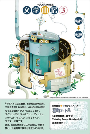 「文学山房」はSFを中心とした小説をイラストに起こす試みの展覧会で、今回で3回目の開催となります。今回モチーフにしたのは、ヴォネガット、ギブスン、プリーストなどです。前回2008年の開催から2年間に読みためた、気になる小説からピックアップしました。「文学を感じる音楽」からのピックアップも数点有ります。