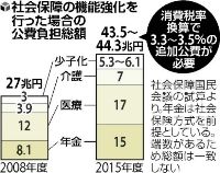 機能強化で追加的に必要となる財源額を初めて試算し、基礎年金の財政方式で現行の「社会保険方式」を維持する場合は2015年度に消費税率換算で3.3~3.5%、「税方式」に切り替えた場合は同年度に6~11%の追加財源がそれぞれ必要になるとしました。