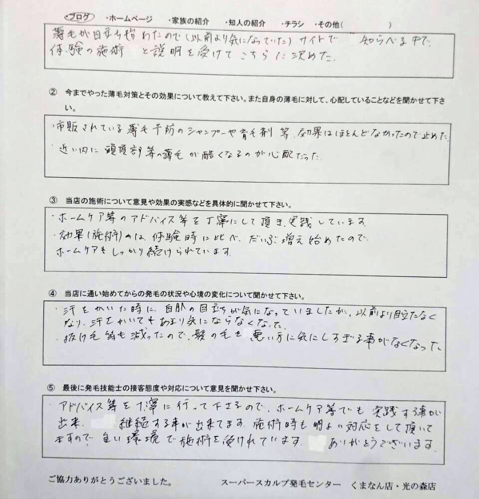 初めの方は、なかなか生えてこず不安や心配をしていましたが、生活面の見直しなども指摘してしてもらい、週2回の治療で、半年後にはほとんど抜けた髪の毛が生えて凄く嬉しかったです。