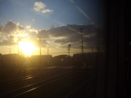 室蘭に差し掛かる頃には夕暮れ時に。見えずらいですが背景に「白鳥大橋」が映っています。