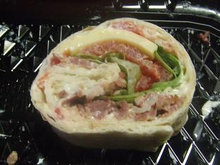お昼にかかったので昼食に、ということで買ってみた、ベーコン、チーズ、レタス、トマトなどをトルティーヤ生地で巻いたロール。12個入りで税込み998円。