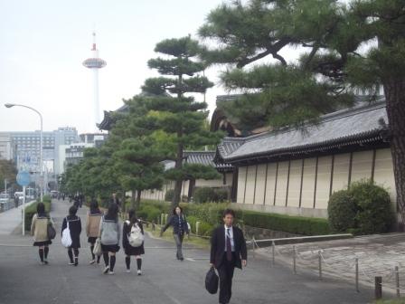 本願寺前を行きかう人、背景は京都タワー。
