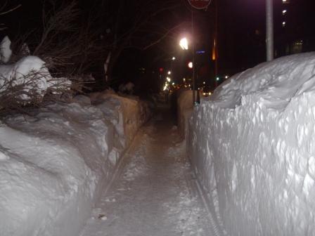 今日午後のお客様の帰り道。右手に見える雪の壁、私の身長を越えていました。