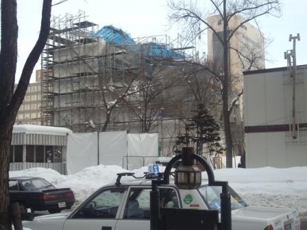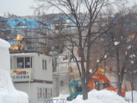 新聞記事によると、雪像は作りたてより会期終了時の方が高さにして1m近く縮むそうです。原因は自らの雪の重さと日中融けること、だそうです。