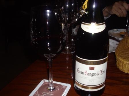ワインリストの中からスペインワインである、ミゲルトーレス社の「グラン・サングレ・デ・トロ」をチョイスしていただきました。ちょっと変わった品種のブドウを配合していて、力強い、スペインの赤ワインらしい味わいで、地の味、土の味を感じます。