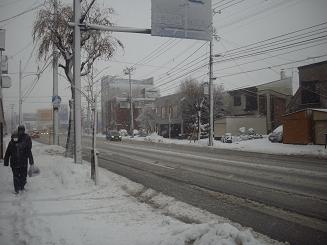 当然歩道は雪半分、水半分の状態。ちょっと丈の高い雪靴でないと即、浸水という感じでした。こういう状況だと水が流れていかないので歩きにくい…