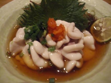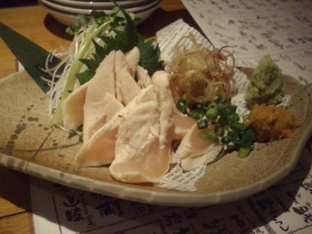 最初に「とりわさ」。薬味がたっぷりとついているのがうれしい。本わさびのほかに山わさびもついています。