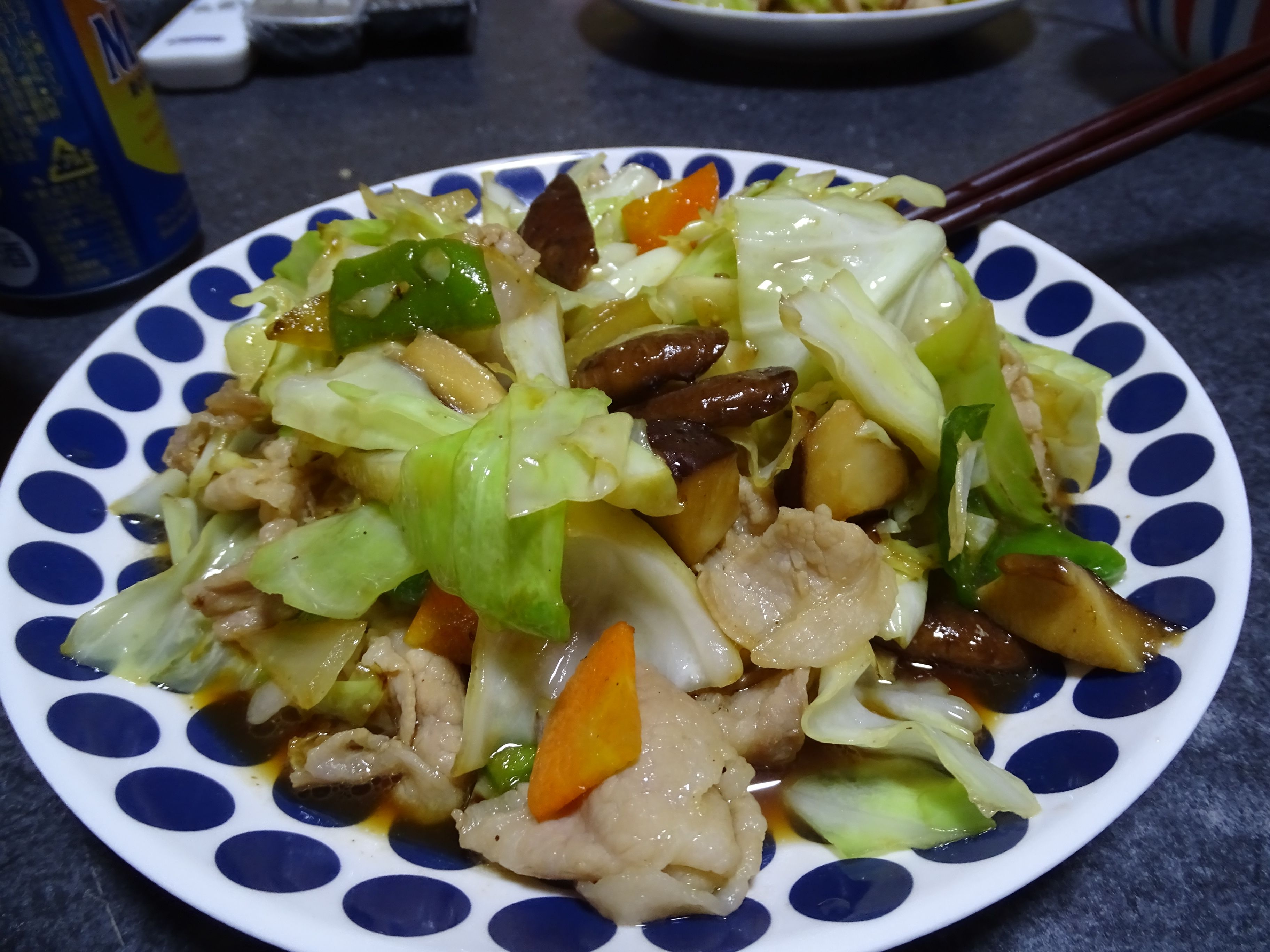 野菜炒め???野菜炒め・・・なのかな??? キャベツ・人参・ピーマン・椎茸・豚肉・・・オイスターを使って さらに盛り付けたら・・・一皿二人前くらいはありました 自分で作っといてなんだけど・・・・・美味い !!! 休みなんで・・・飲み物はビール・・・・ 息子は流石に・・・半分たべたら・・・もう無理だって・・・・・・・ なので私はビールをオカワリで息子の残したやつを食べないと・・・・