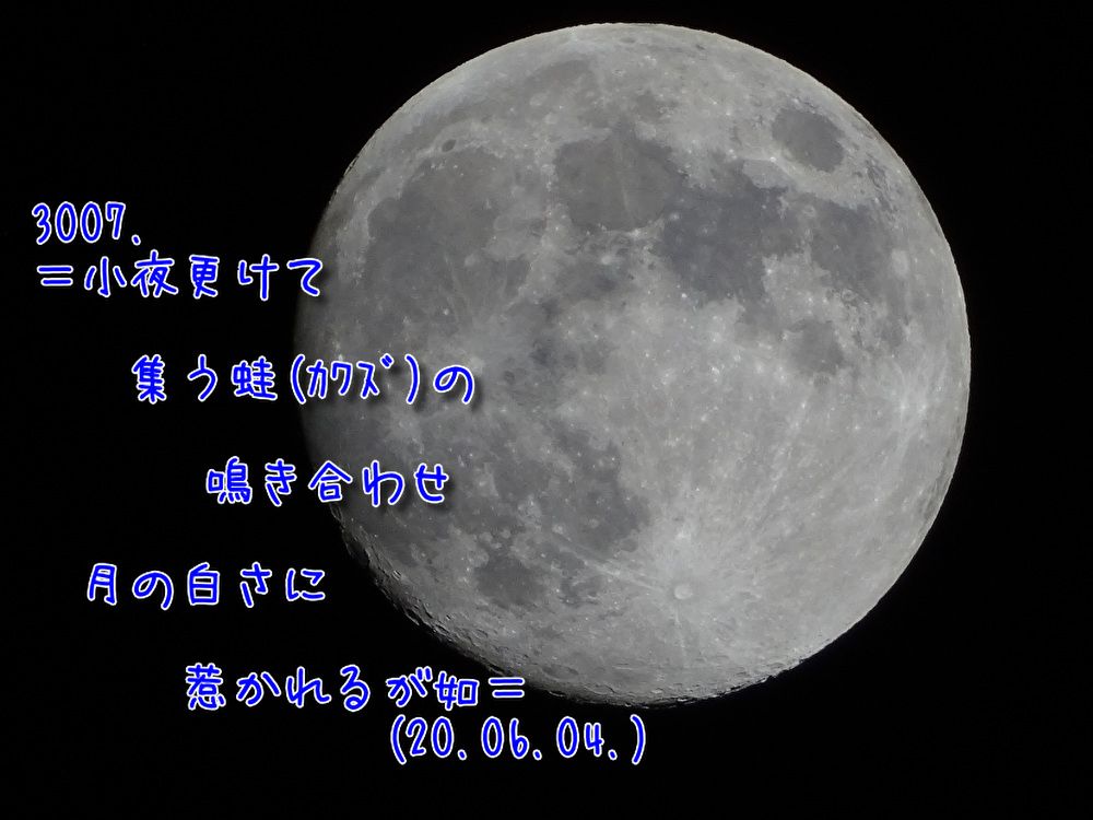 月の白さに・・月におされて出勤すれば・・・田んぼからカエルの大合唱・・・・・ 私を応援してるのか・・・月が綺麗だと歌っているのか・・・・・ ・・・・私を応援してるんだな・・・・・うん 私もあれくらい自慢できる様な喉があればなぁぁぁぁぁぁぁ