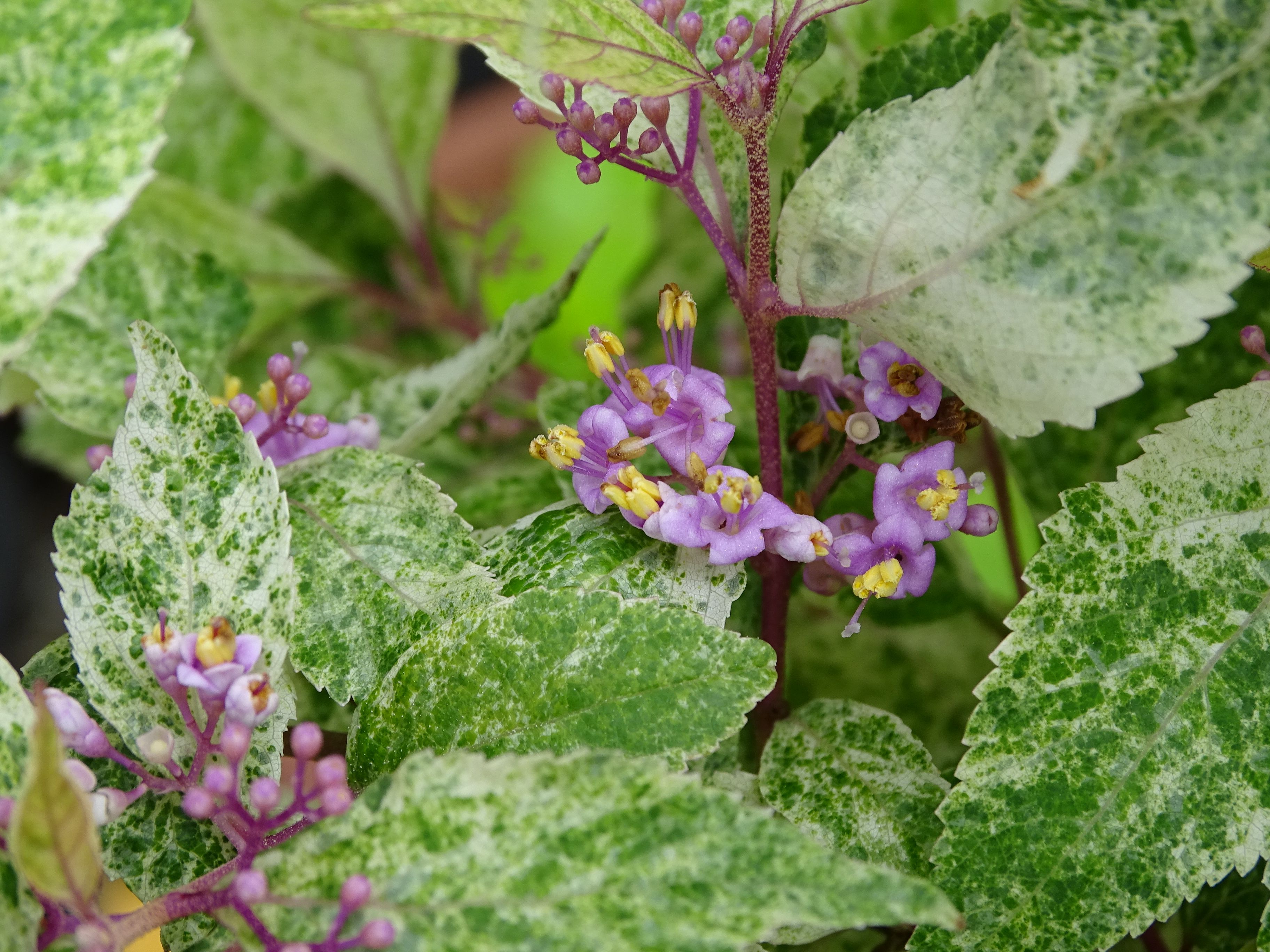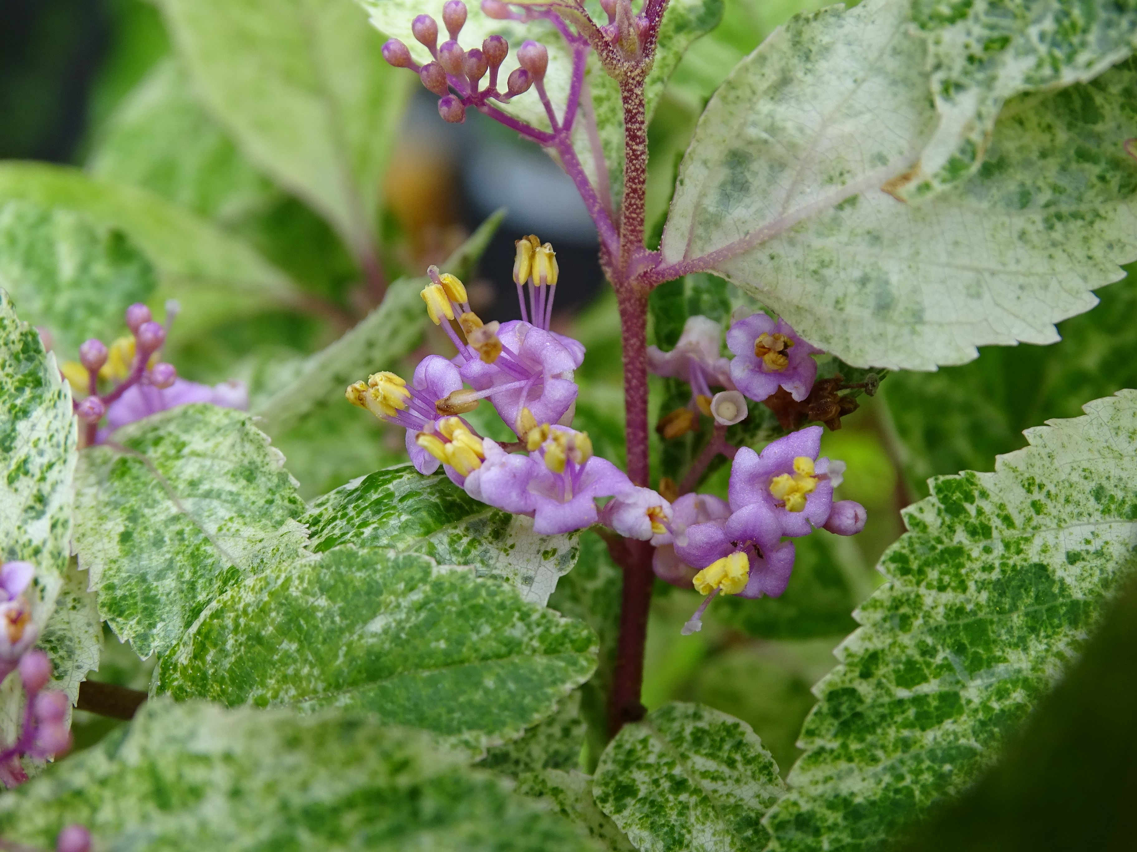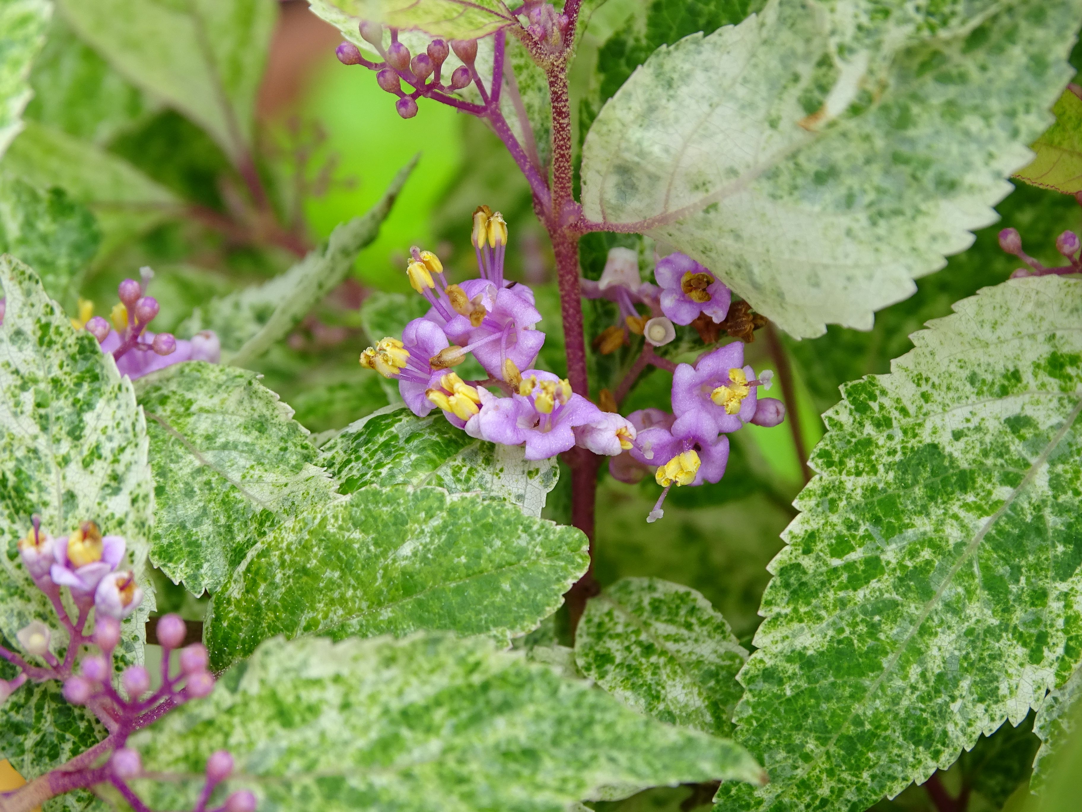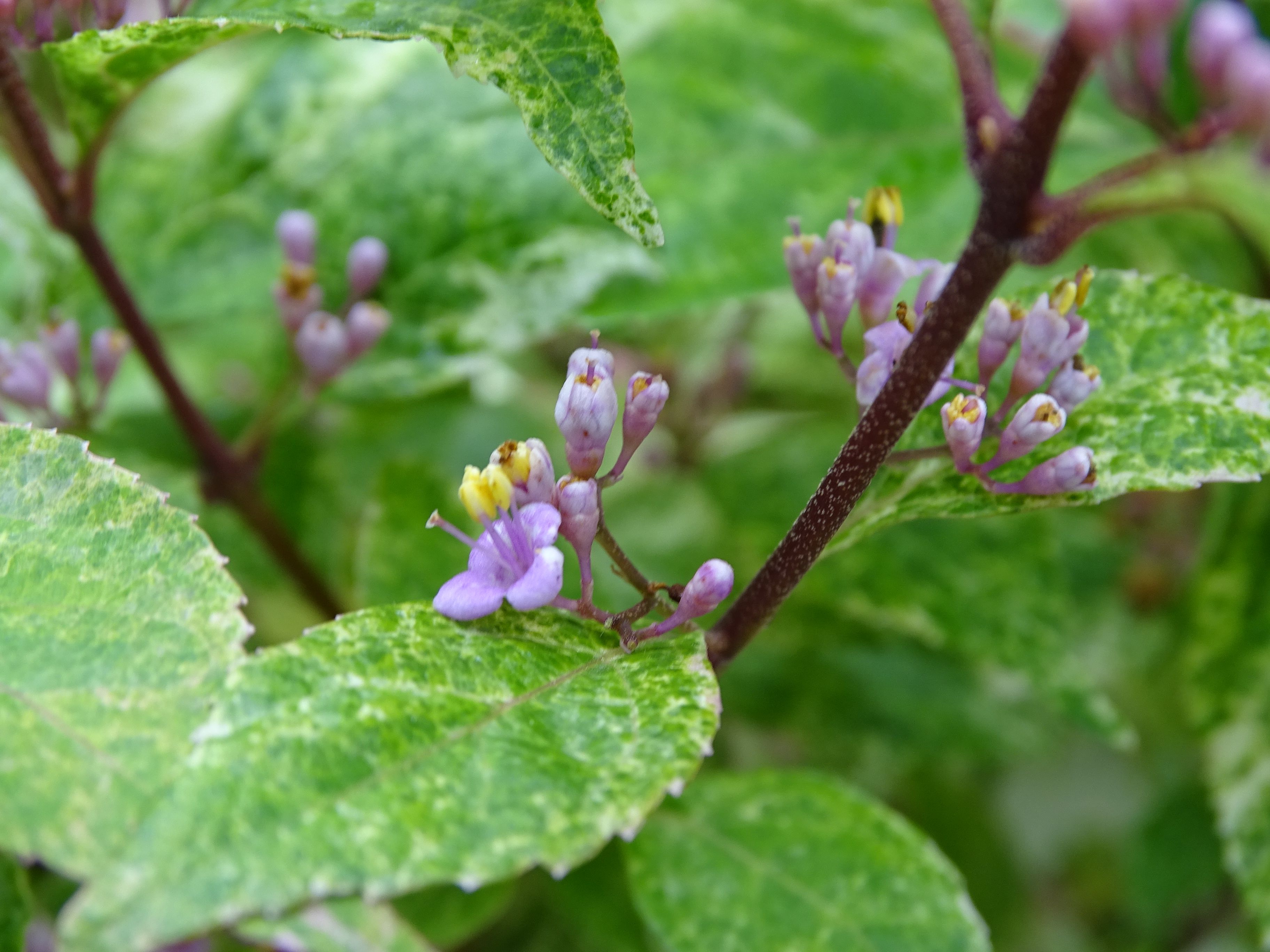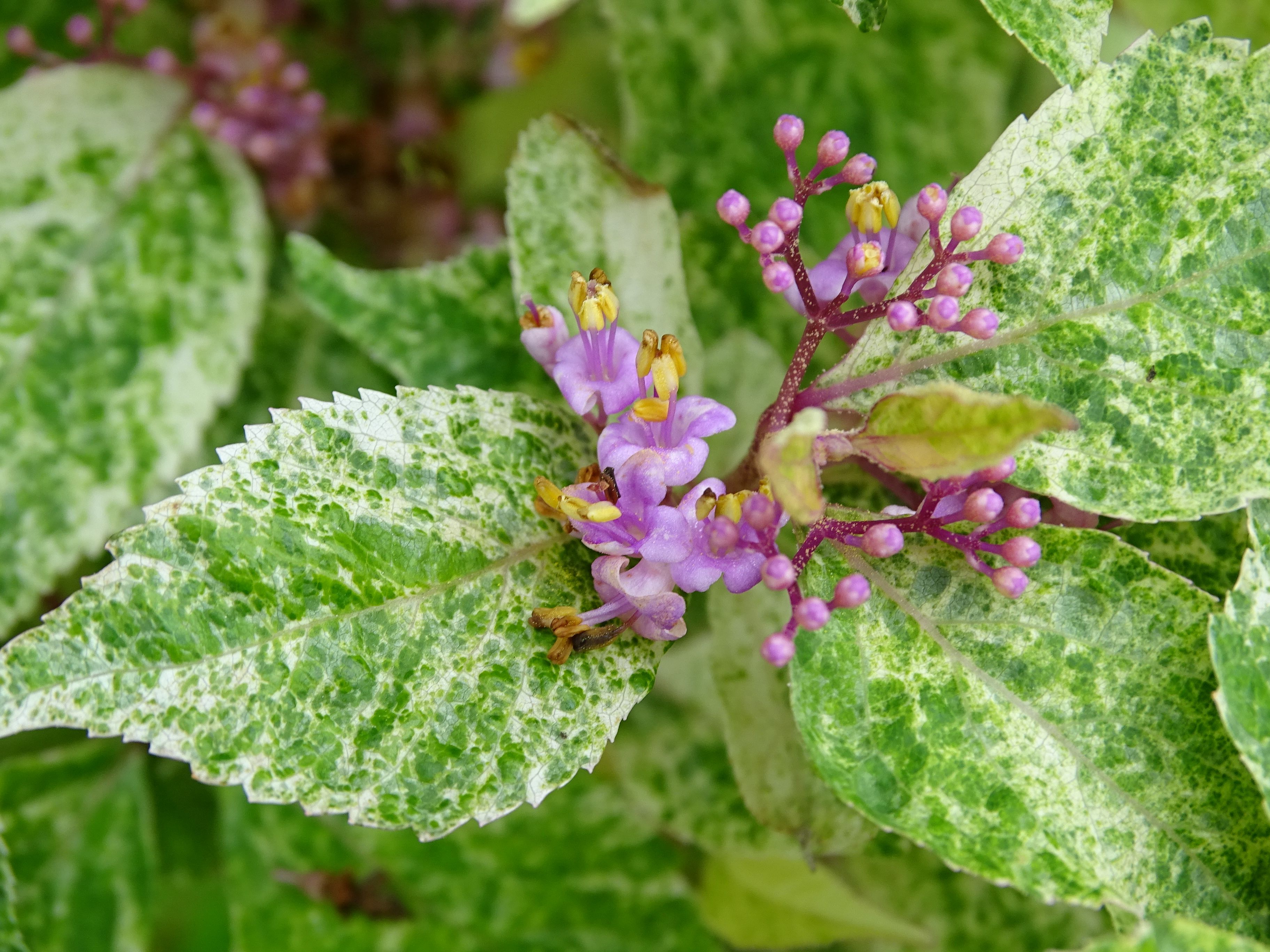 咲き始めた・・昨夜の時折強くなる雨・・・・まだ一週間はこんな状態なのかな そして・・・今朝の紫々紫(斑入り紫式部)・・・咲き始めたね~~~~~ この紫々紫が満開になったら絶対に綺麗だよねぇぇぇぇぇ 昨年もこうやっていっぱいの花を咲かせたのに・・・実がならない・・・・・・ ネット検索するとちゃんと実がついてるものを紹介してるのになぁぁぁぁ とりあえず・・・今年も期待はしてみようかな・・・・