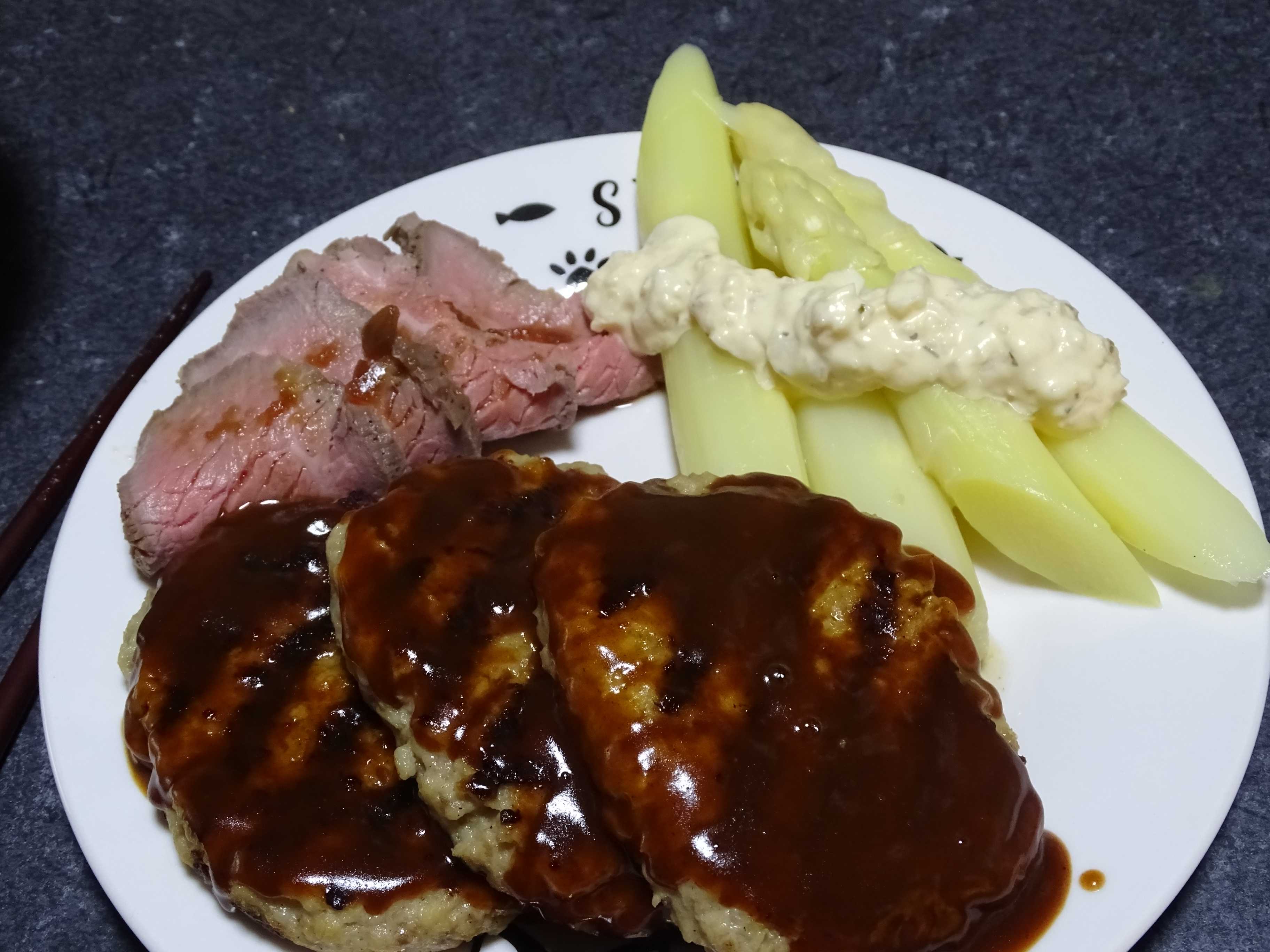 昼食&夕食今日は・・洗い物を少なく・・・という事で1プレート・・・・ ちょっとプレートがちっちゃかったかな・・・・1人4本のはずのホワイトアスパラが・・・ 2本しかスペースがない・・・ ダイソーではこれ以上大きなものはないしなぁぁぁぁ 数を増やすしかないかぁぁぁぁ・・・楽をしようとするのもたいへんだね・・・・