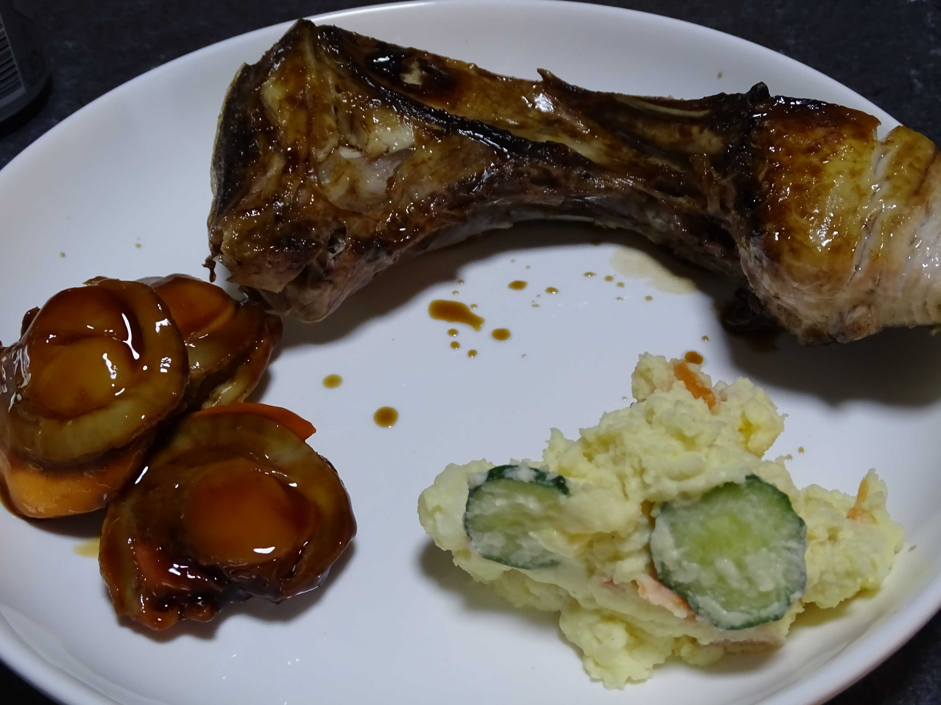 で・・・食事は魬のカマ・・・それに・・ホタテ照り焼き・ポテトサラダ