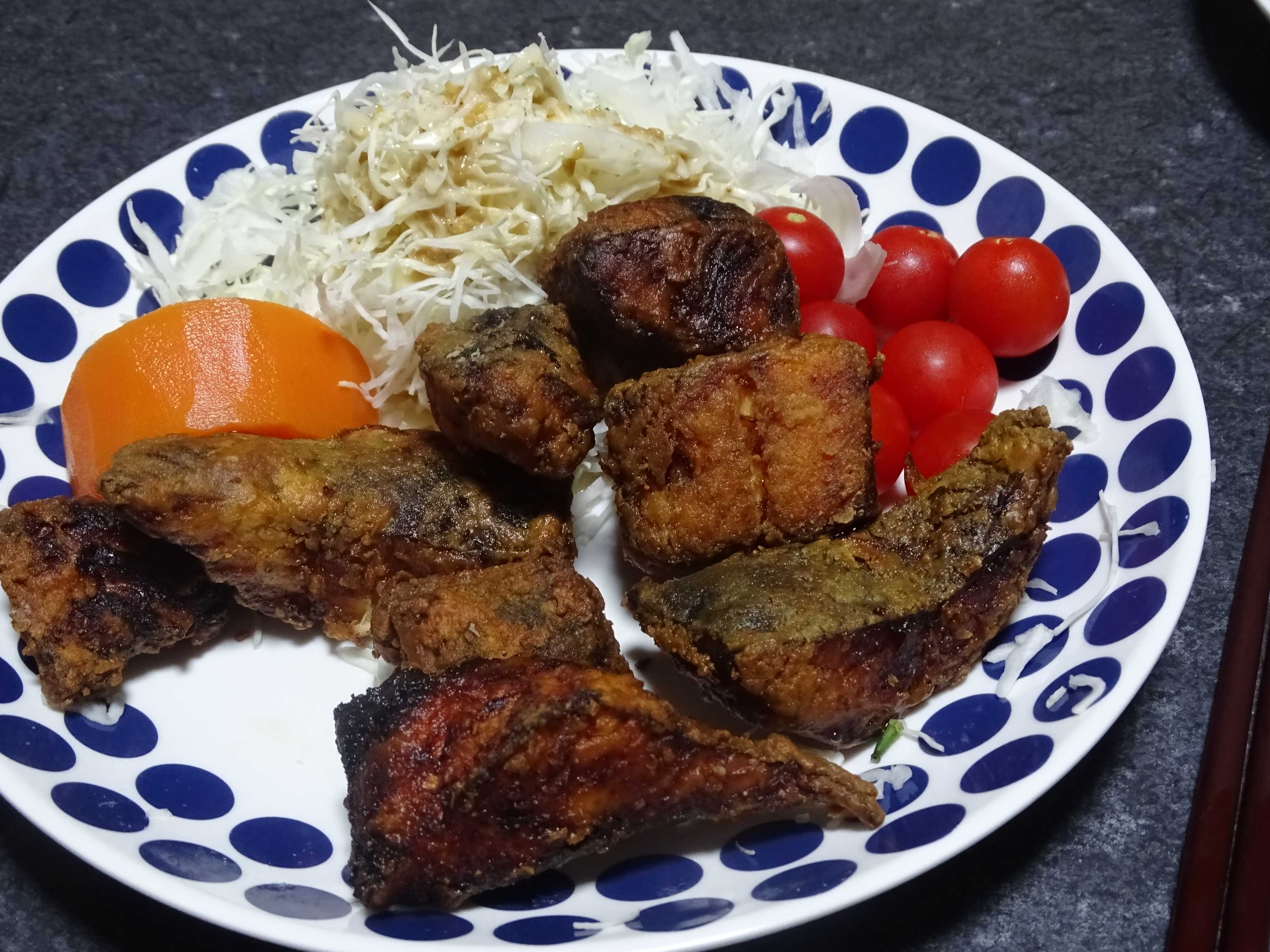 今日の夕飯は今日は・・昨日3枚おろしにした本鱒・・・・・唐揚げにしちゃいました 朝タレに漬け込み・・息子が帰宅してから揚げる・・・・ ・・・けど・・・またやっちゃった・・・アハハハハ 2個食べてから撮るのを思い出しました・・・へへへへへ ちょっと新しい油ではなかったので・・そして・・ちょっと揚げ過ぎちゃった 低温で揚げたんだけど・・低温だと思って過ぎちゃいましたね 1人半身・・・大丈夫かと思ったのですが・・・やっぱり多かった お腹パンパン・・・フウゥゥゥゥゥ