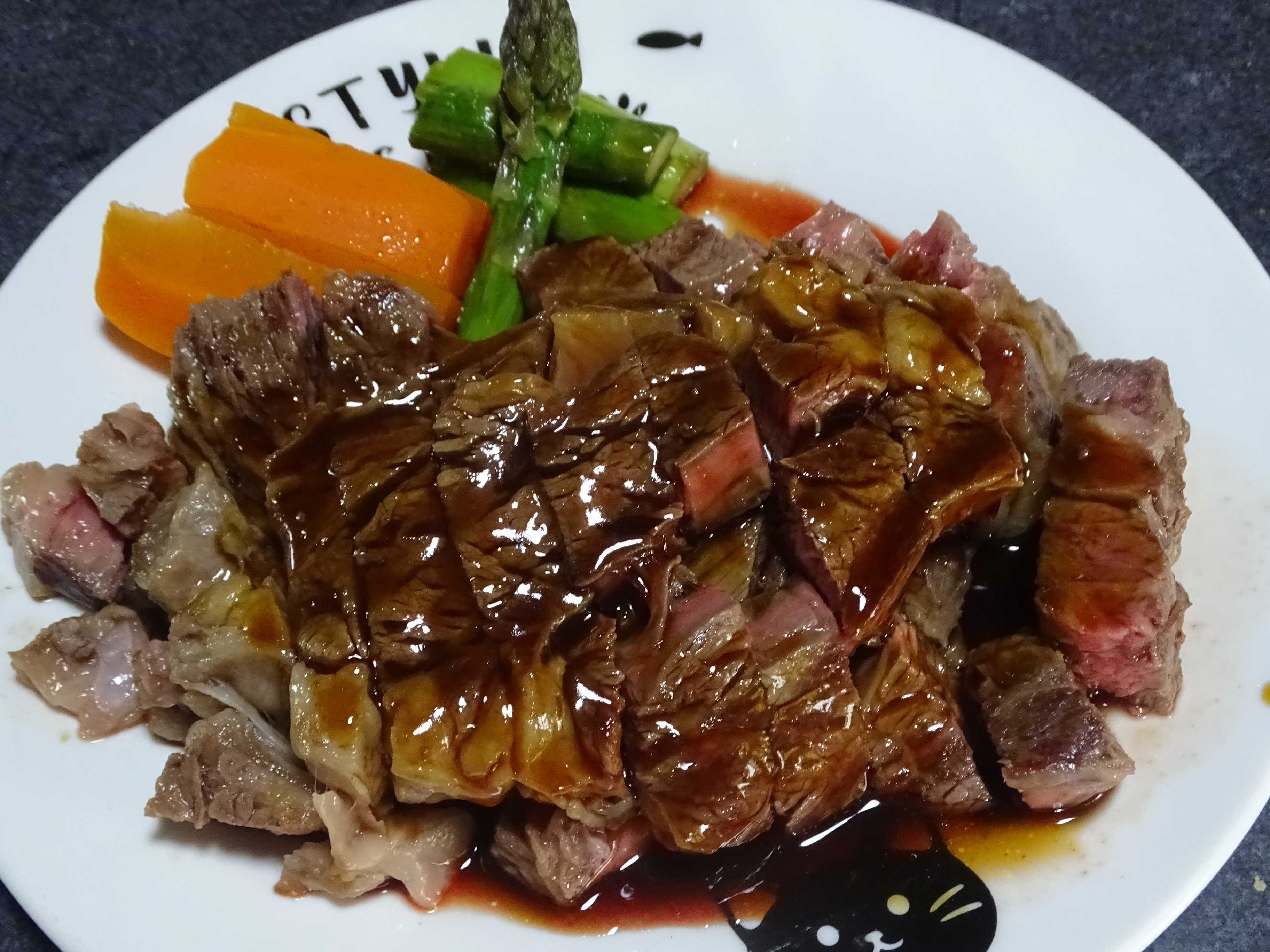 今日の食事は・・今日は昨日買っておいた 牛の肩ロース・・1人400g・・・ 付け合わせは・・人参グラッセ・アスパラ 400gだったからこのプレートには・・・なので半分にして重ねるしかなかった・・・ハハハ 焼売もあったんだけど・・忘れてたから・・べつに盛り付けて・・・ ふ~~~~流石の私もちょっと・・もういっぱい・・・ なんか息子もいっぱいになっちゃったみたい・・・